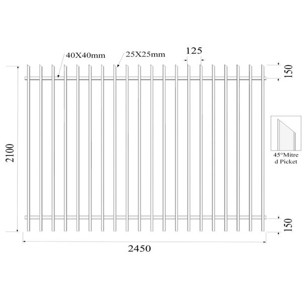picket 25mm*25mm 1.2mm wall thick 2100mmx2450mm width square flat top spacing 125mm 40mm rails Hercules fence panels Images |